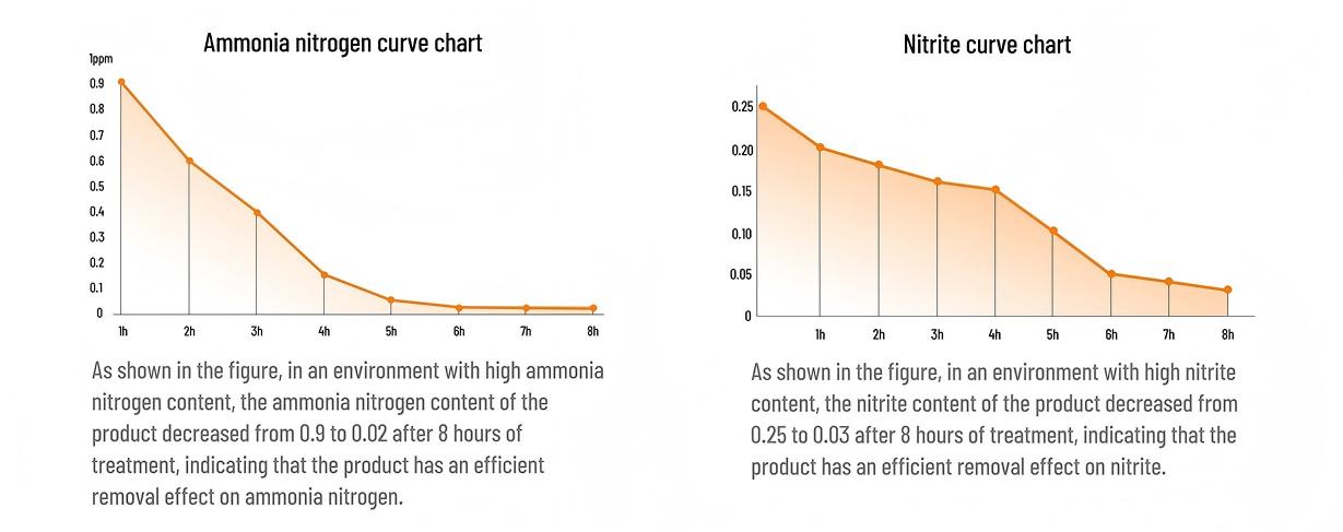 (Image Source: AC Product Catalogue | The charts demonstrate that AC Activated Zeolite Balls reduce ammonia concentration from 0.9 mg/L to 0.02 mg/L and nitrite concentration from 0.25 mg/L to 0.03 mg/L within 8 hours, providing visual proof of its high efficiency.)